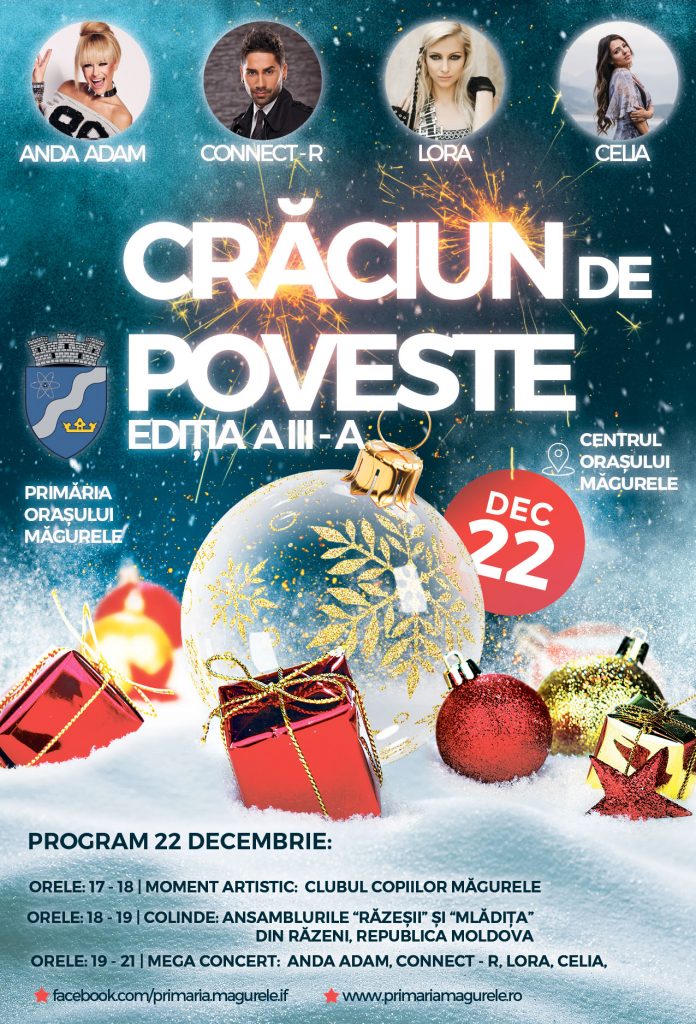 Vor fi alături de noi, la sărbătoarea aprinderii bradului de Crăciun, îndrăgiții soliști Celia,Lora, Anda Adam și Connect-R, într-un spectacol ce va fi greu de uitat.